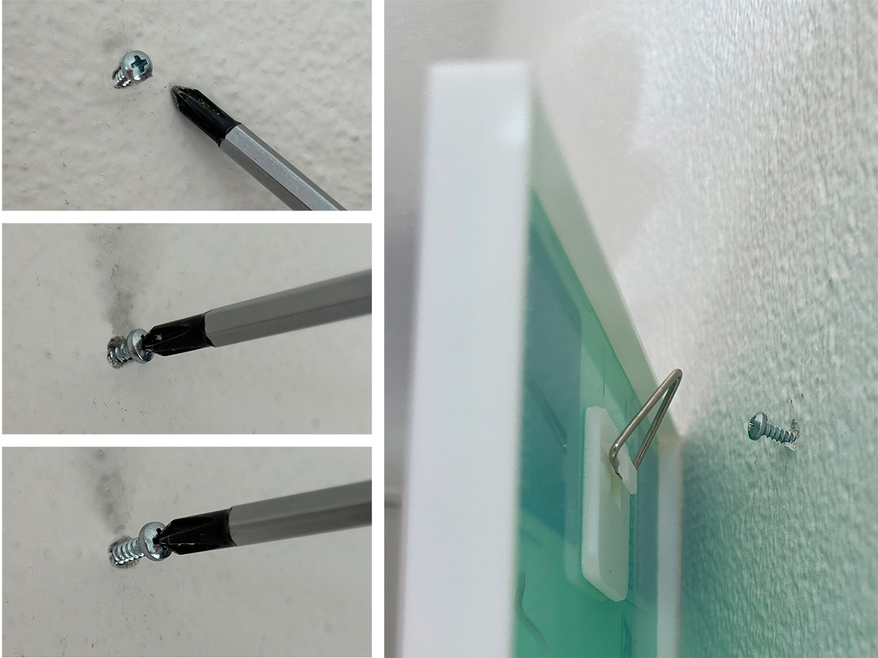 Because the weight of the frame is little, it needs a simple screw in the wall. This way the wall is minimal used. With the screwdriver you can easily justify the best use of the distance. The triangle hook will keep the hanging flexibel and fixes the picture well.